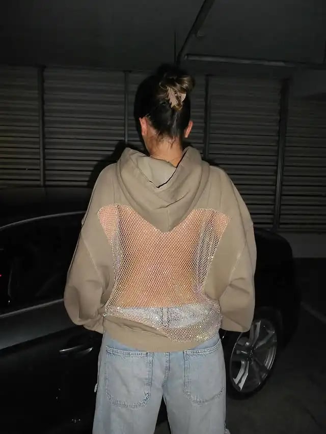 Z przodu to miękka, minimalistyczna bluza z kapturem. Ale odwróć się – i zaczyna się błyszczeć. Błyszcząca siateczka z tyłu subtelnie odsłania Twoją sylwetkę, tworząc idealną równowagę między wygodą a pewnością siebie.