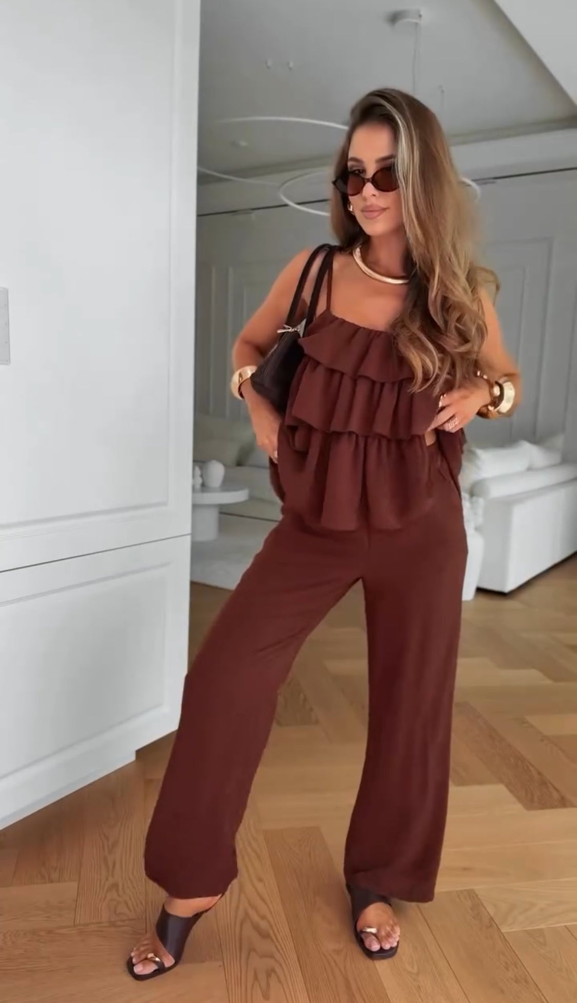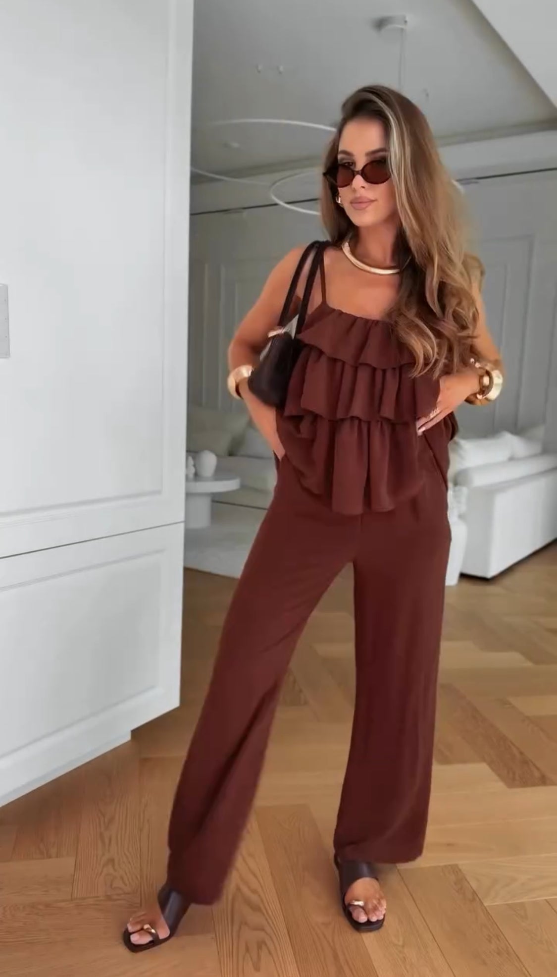Zainspirowany ciepłym klimatem zestaw ten jest idealny dla osób poszukujących eleganckiego i wygodnego stylu.Jego wszechstronność jest gwarantowana przez 2 wariantów kolorów dostępnych dla skoordynowanych top i spodni. Dodaj odrobinę koloru do swojej garderoby i ciesz się komfortem tego unikalnego skoordynowanego!